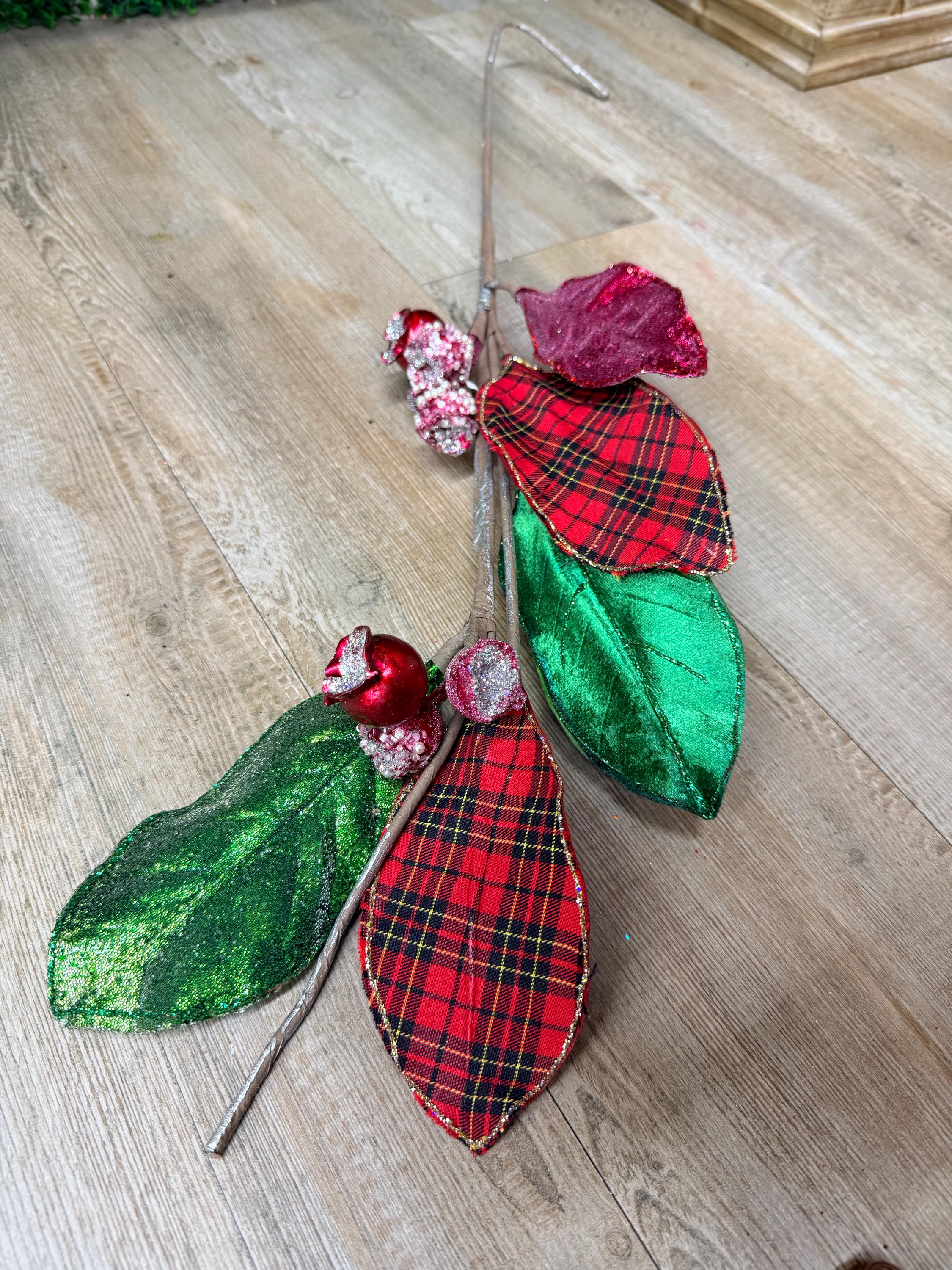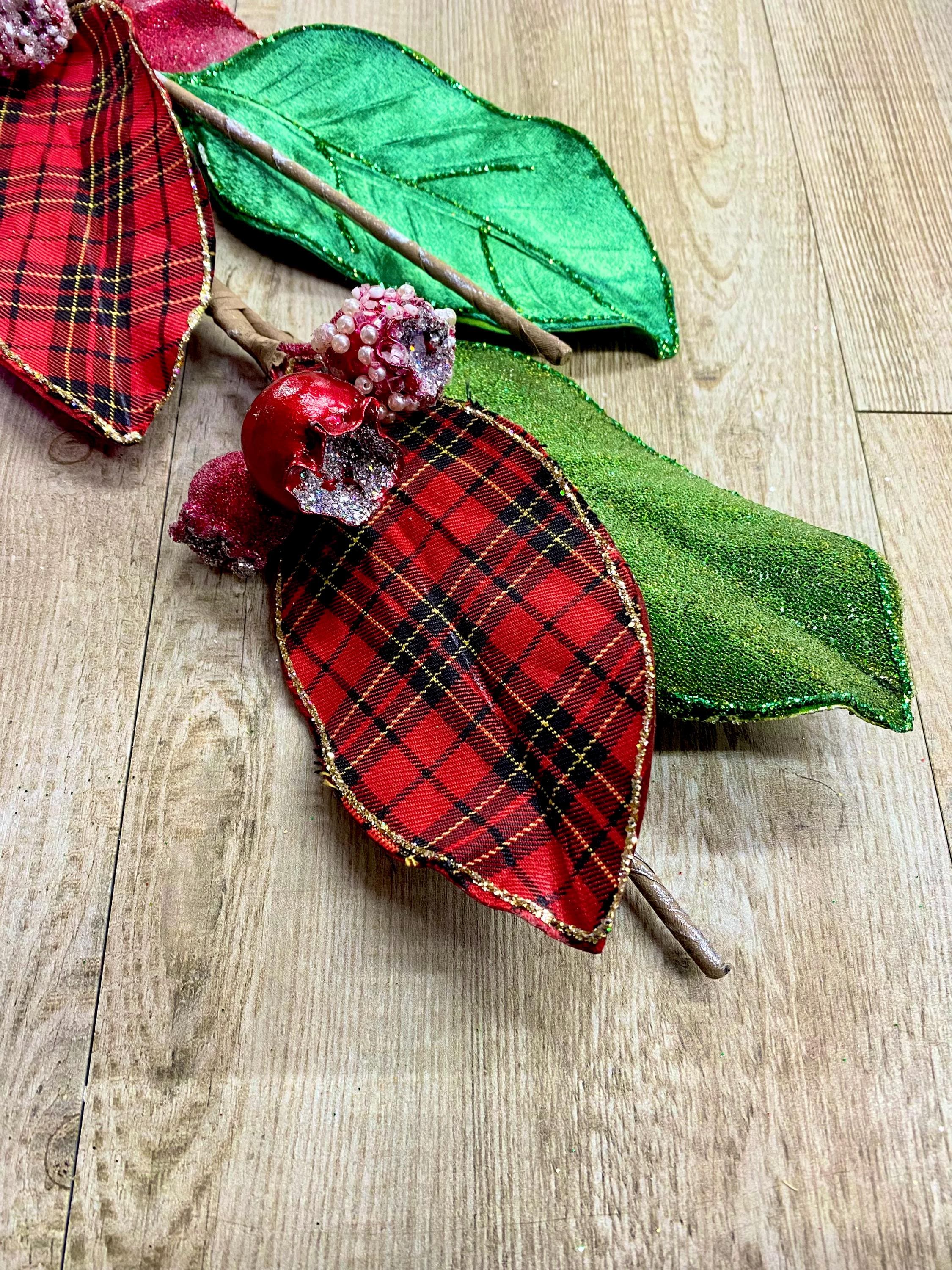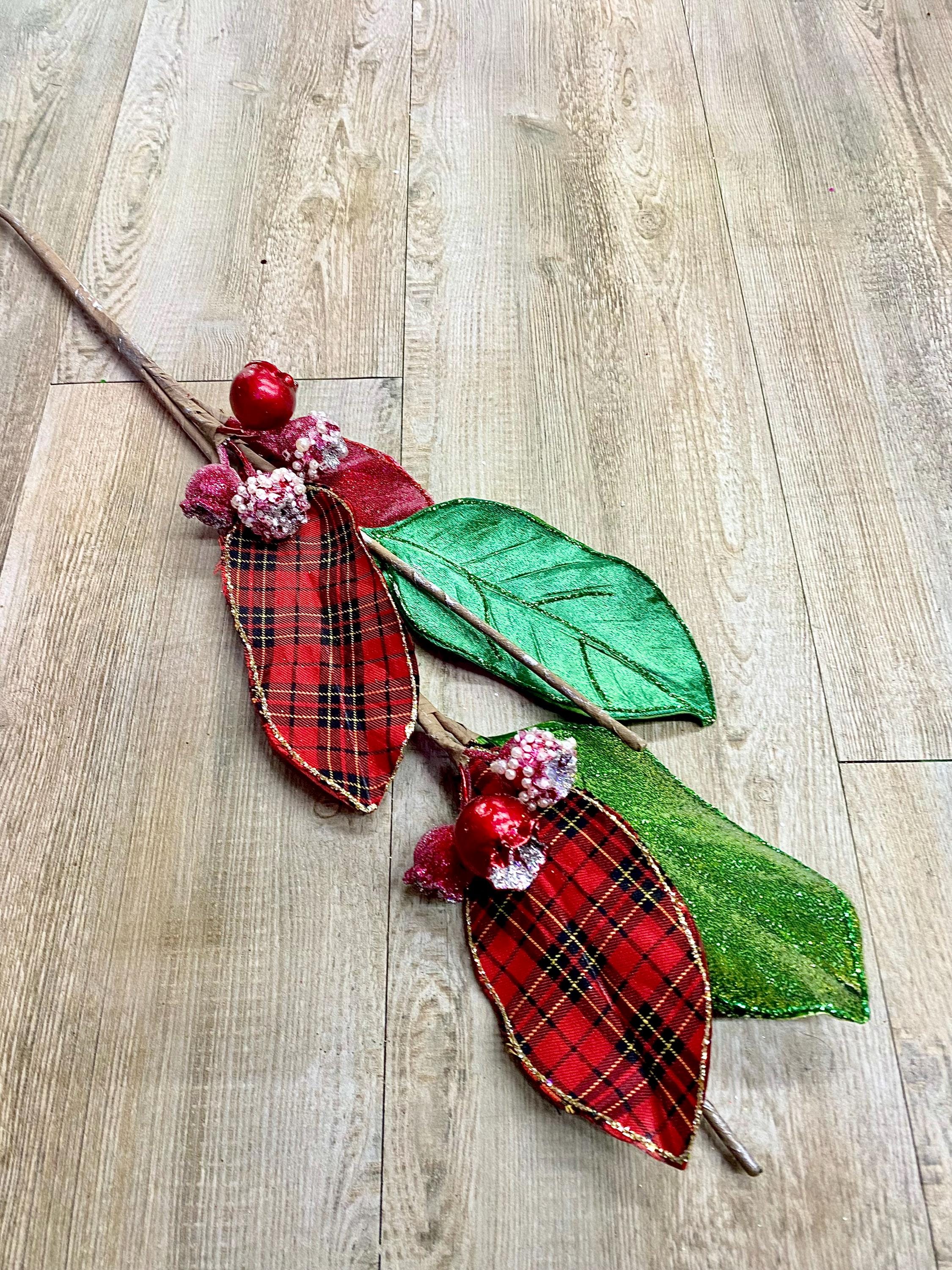 Red and Green Plaid Leaf and Berry Spray - 33.5 inch