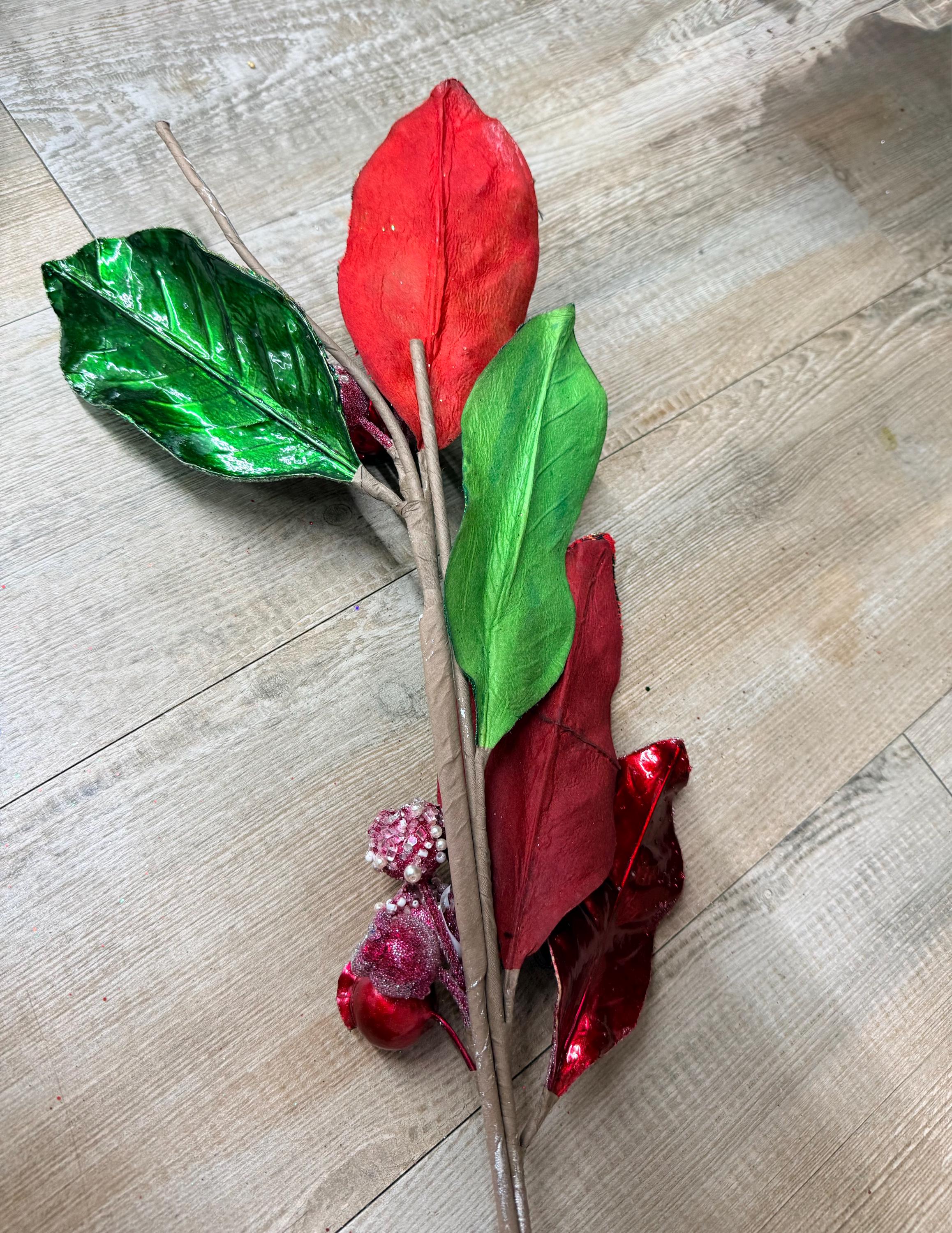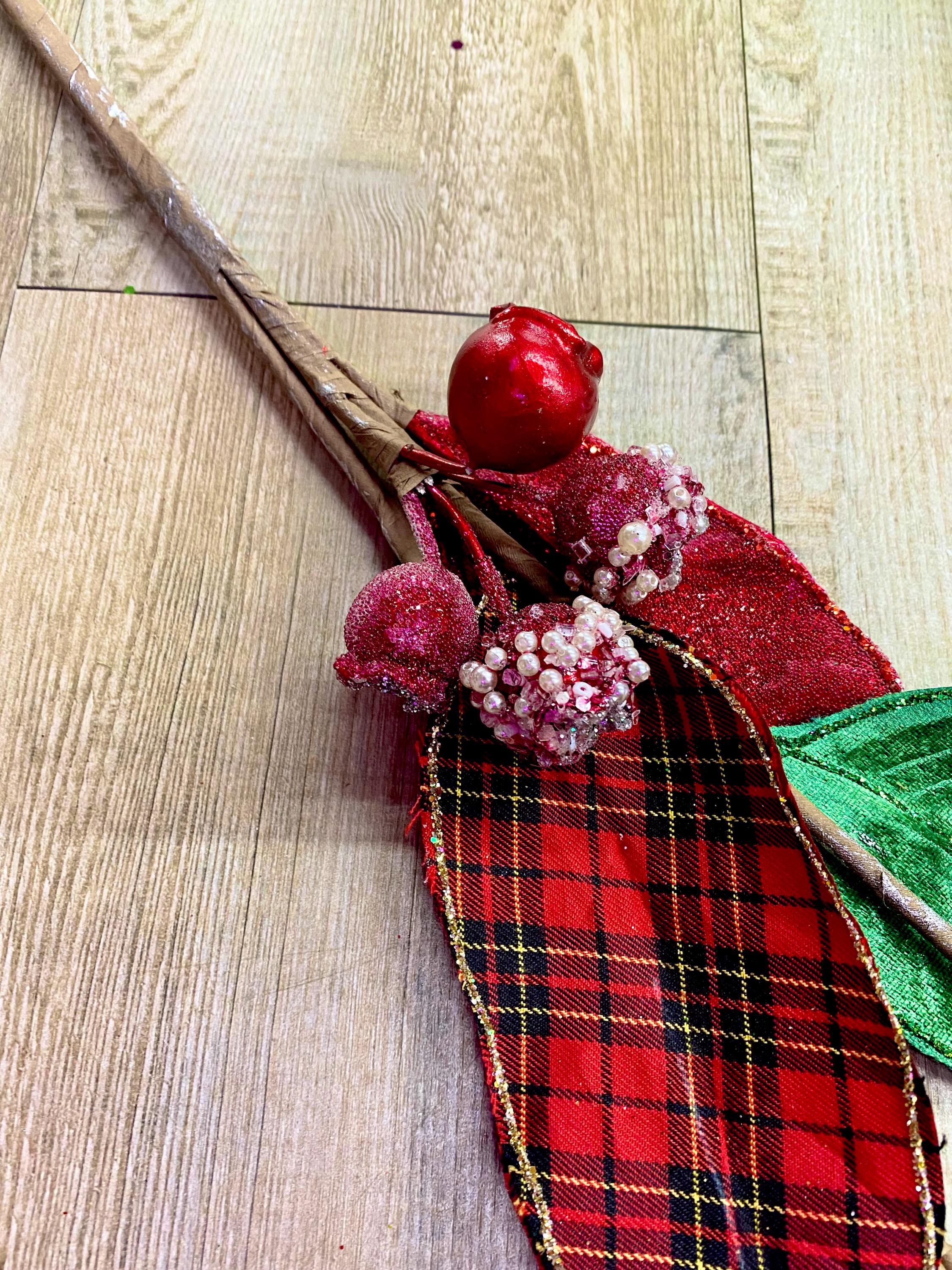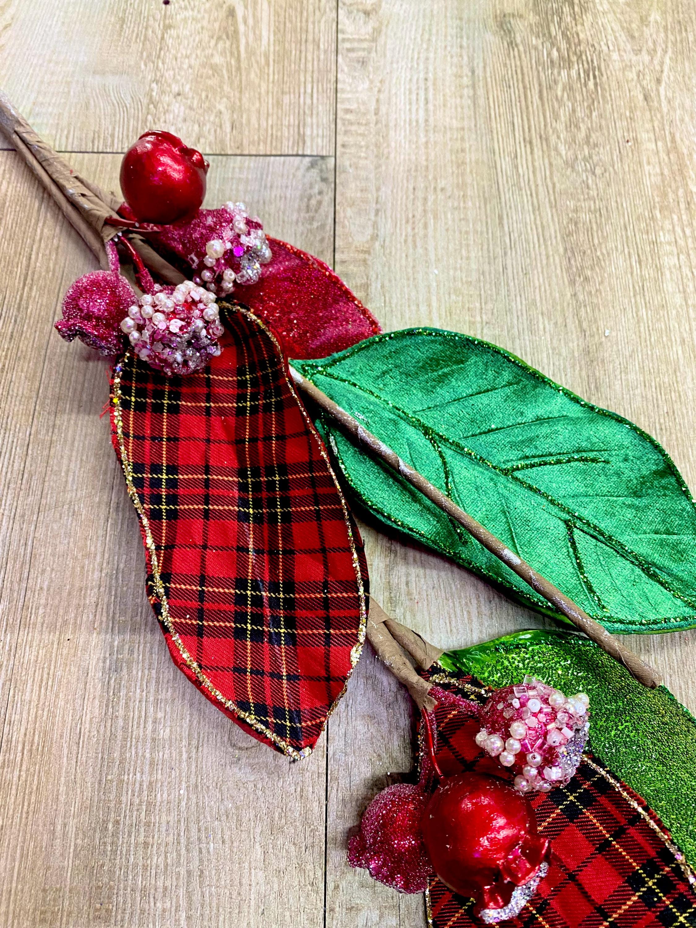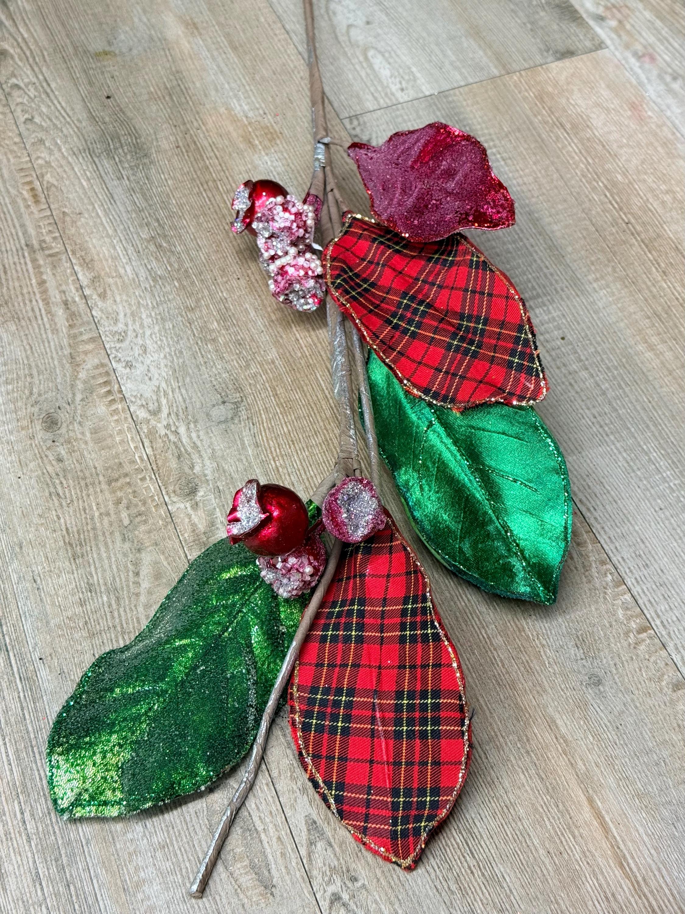 Red and Green Plaid Leaf and Berry Spray - 33.5 inch