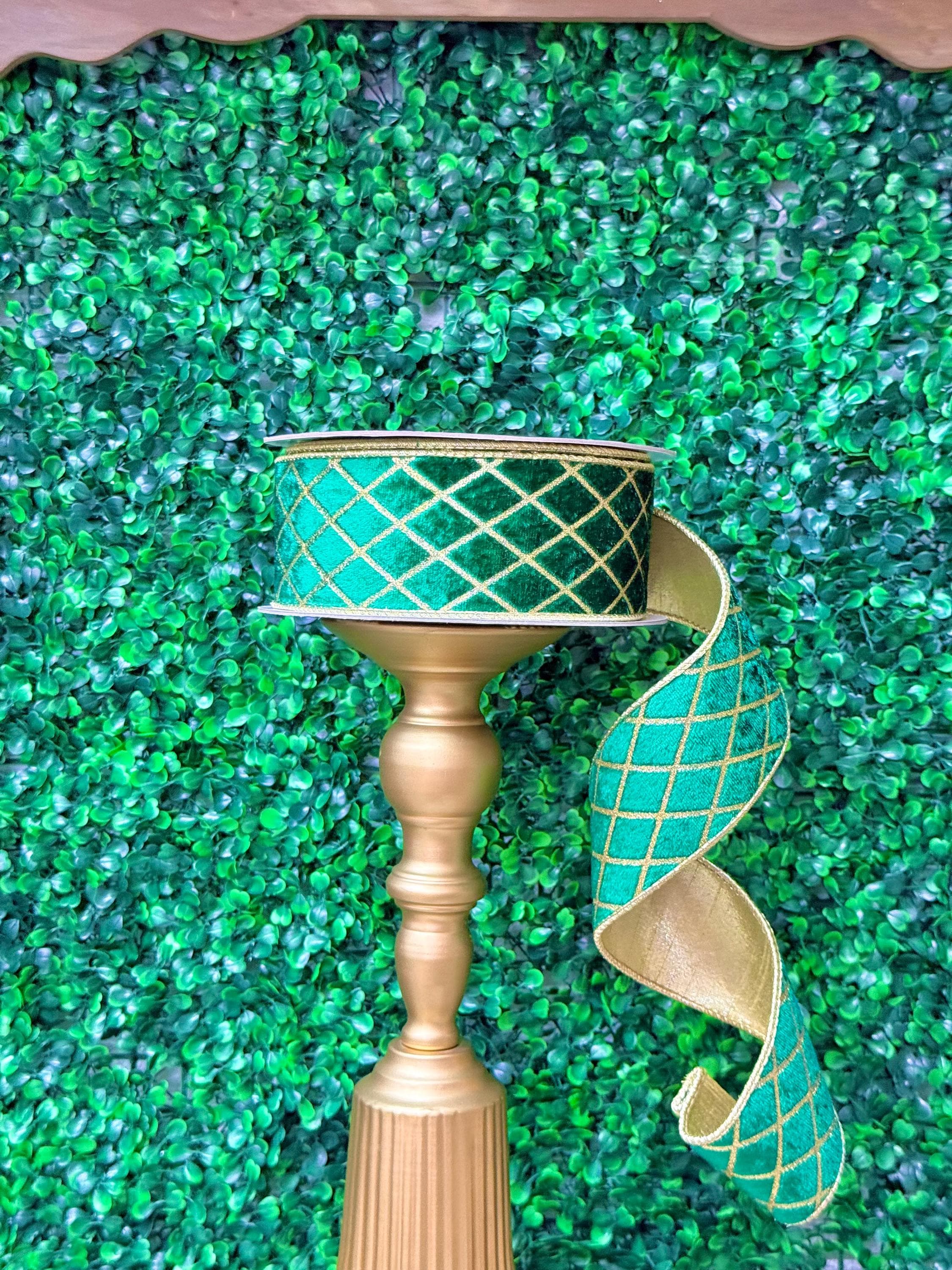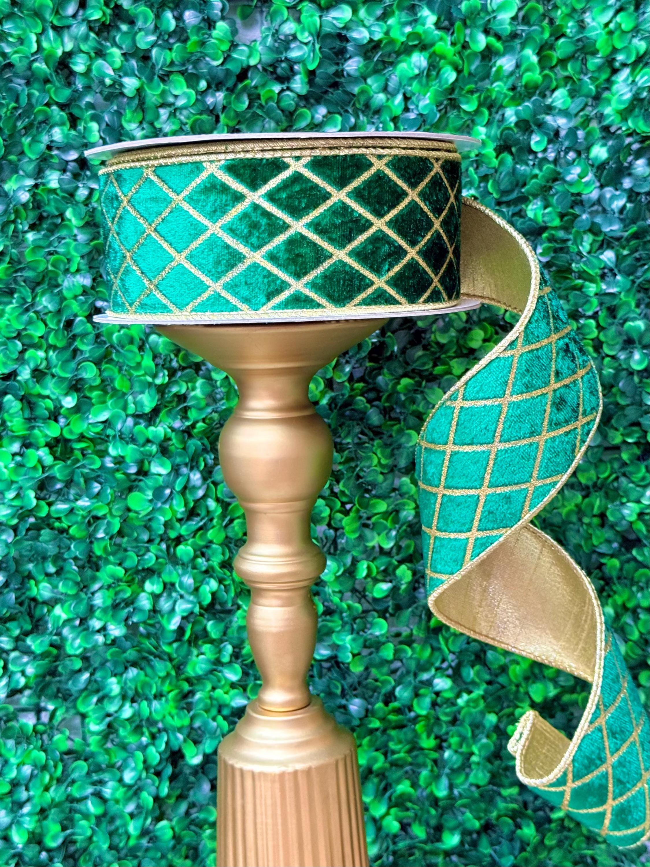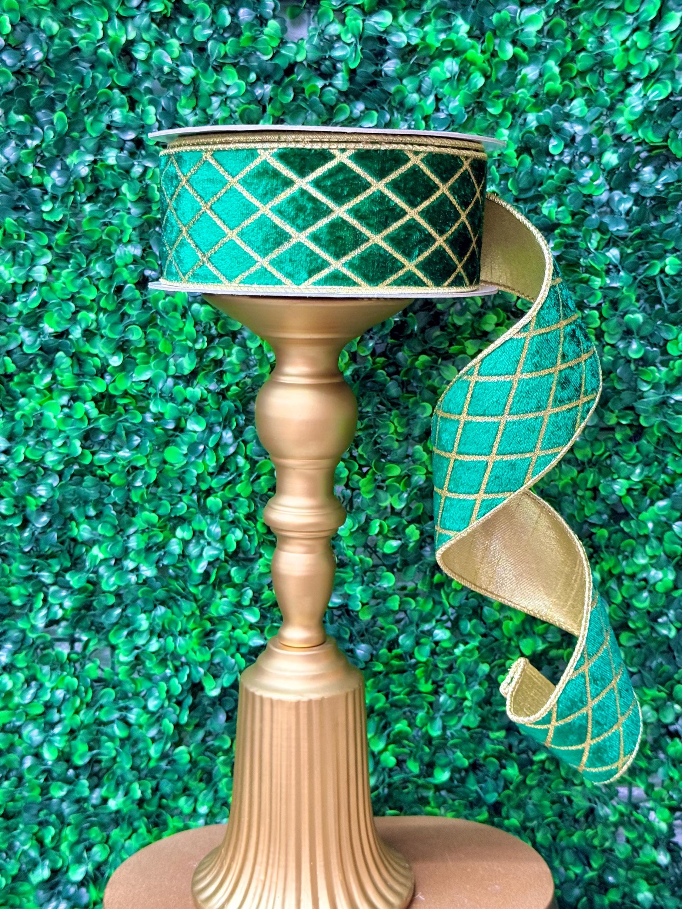 2.5 Inch Emerald Green and Gold Diamond Velvet Ribbon ~ 10 Yards~ Wired