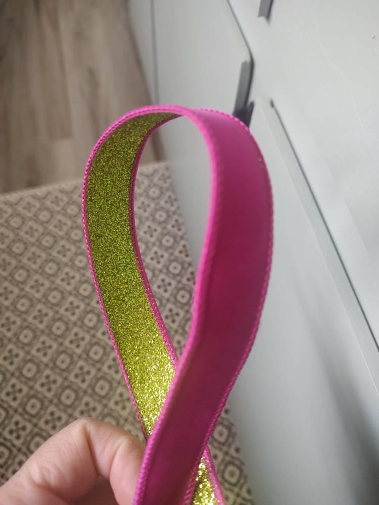 This ribbon is superb! Bright colors, beautiful contrast, little to no glitter shed from the fully glittered green side, and my favorite is the detail of hot pink edges against the glittery lime green side. The wire is thick and will stay wherever you put it. Of course, Farrisilk. This shop is awesome!