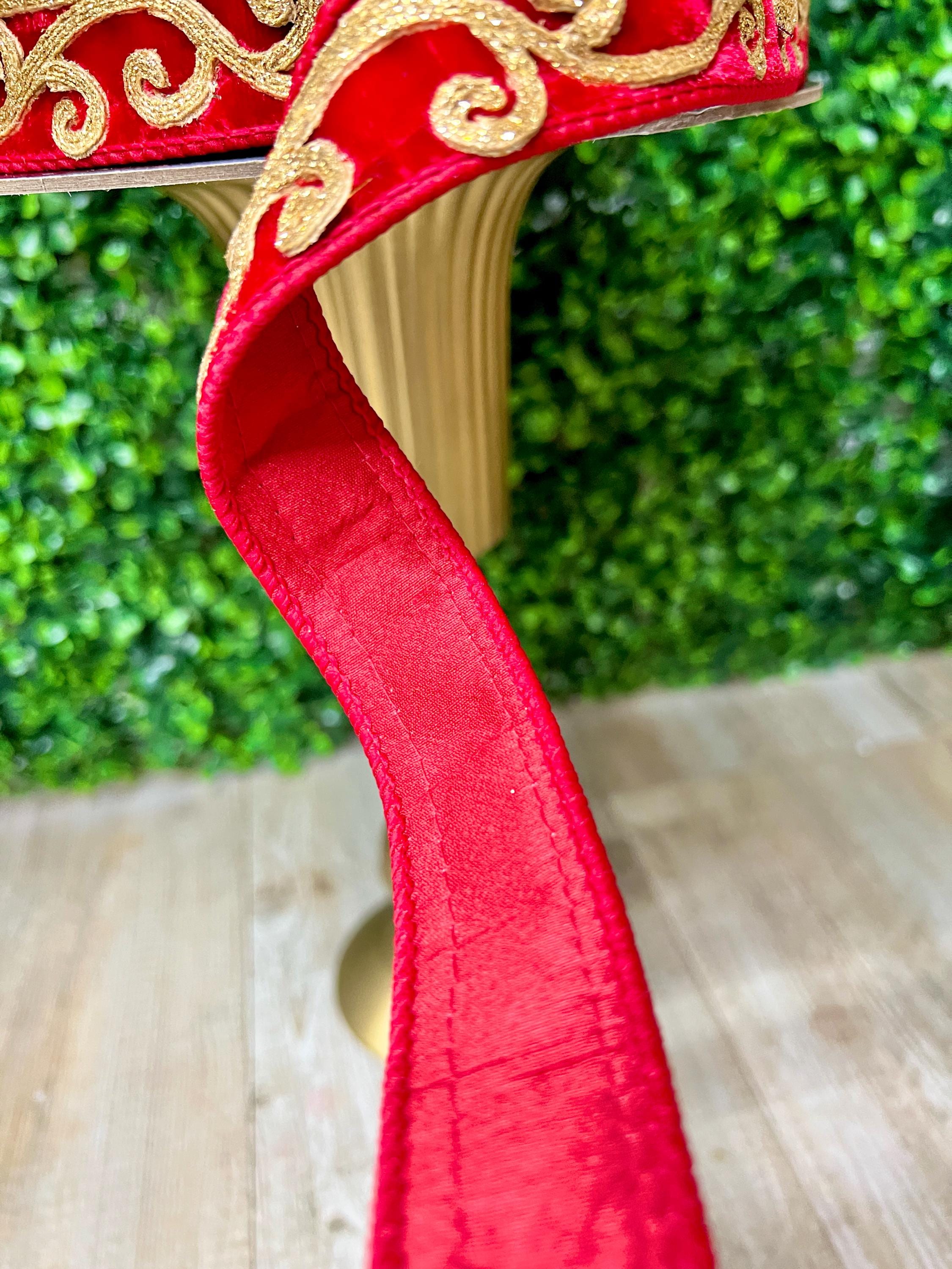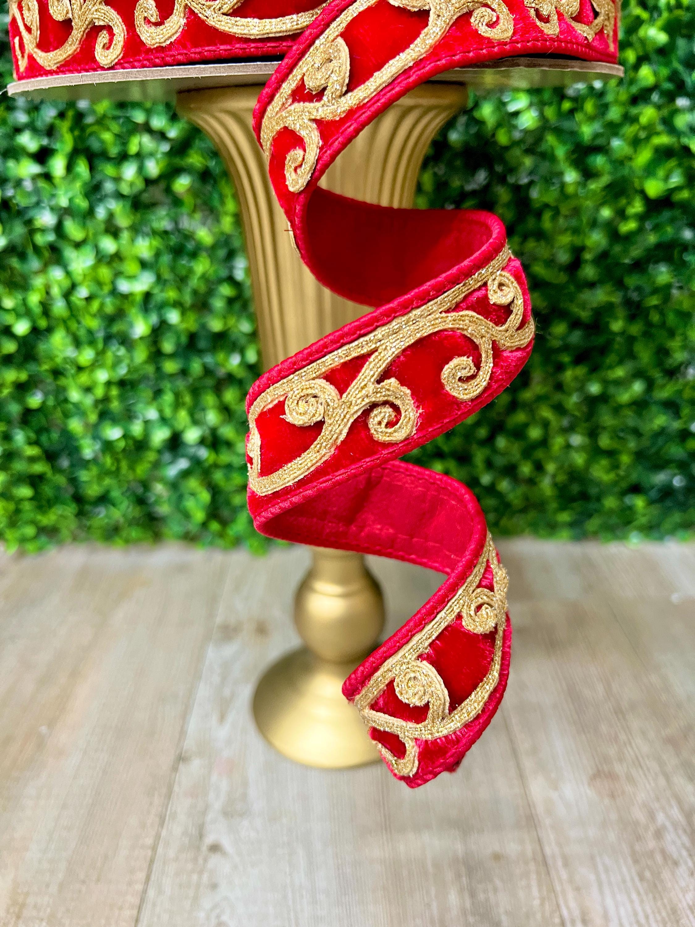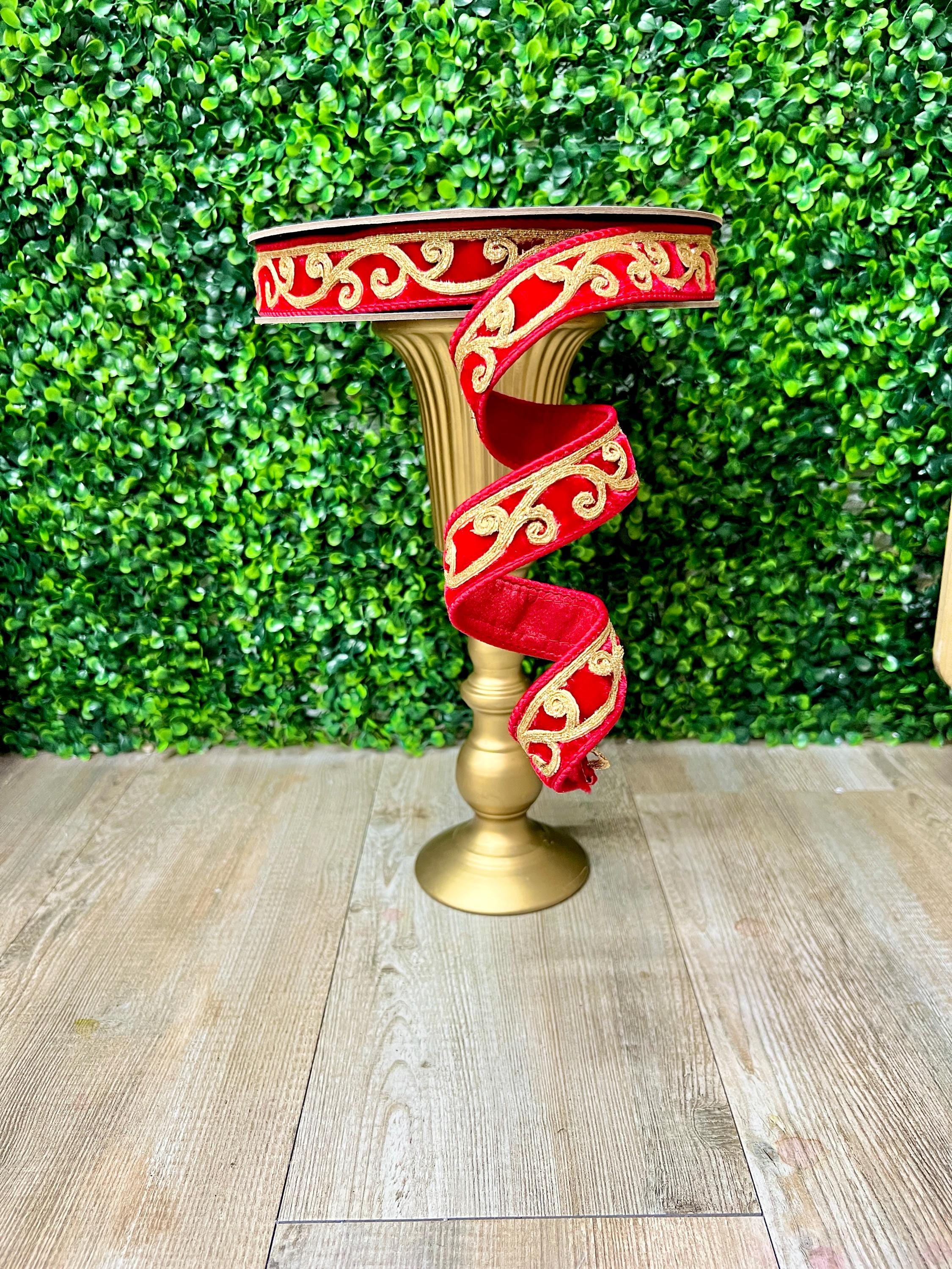 1 Inch Red Velvet Gold Glitter Scroll Ribbon ~ 10 Yards ~ Wired