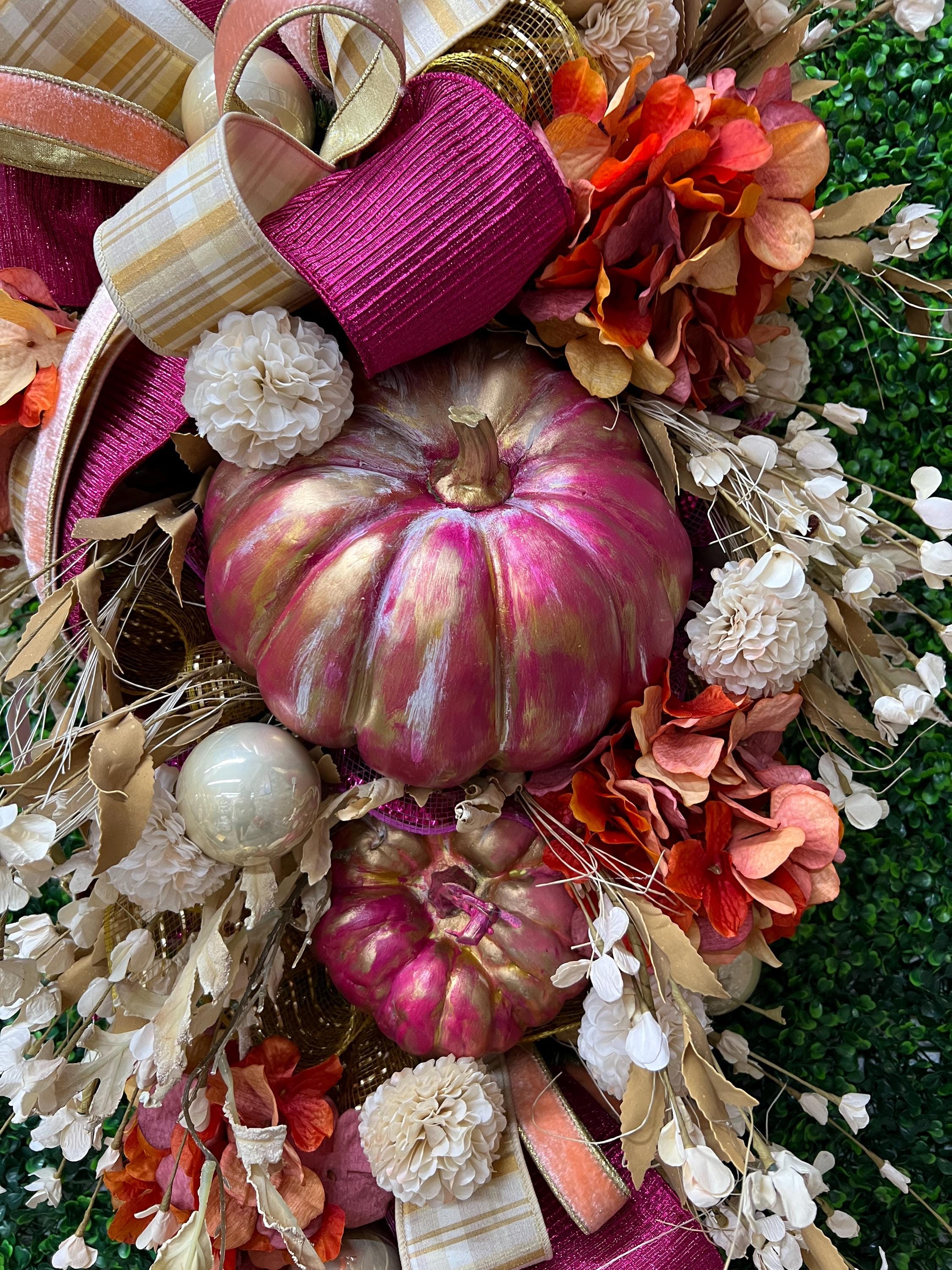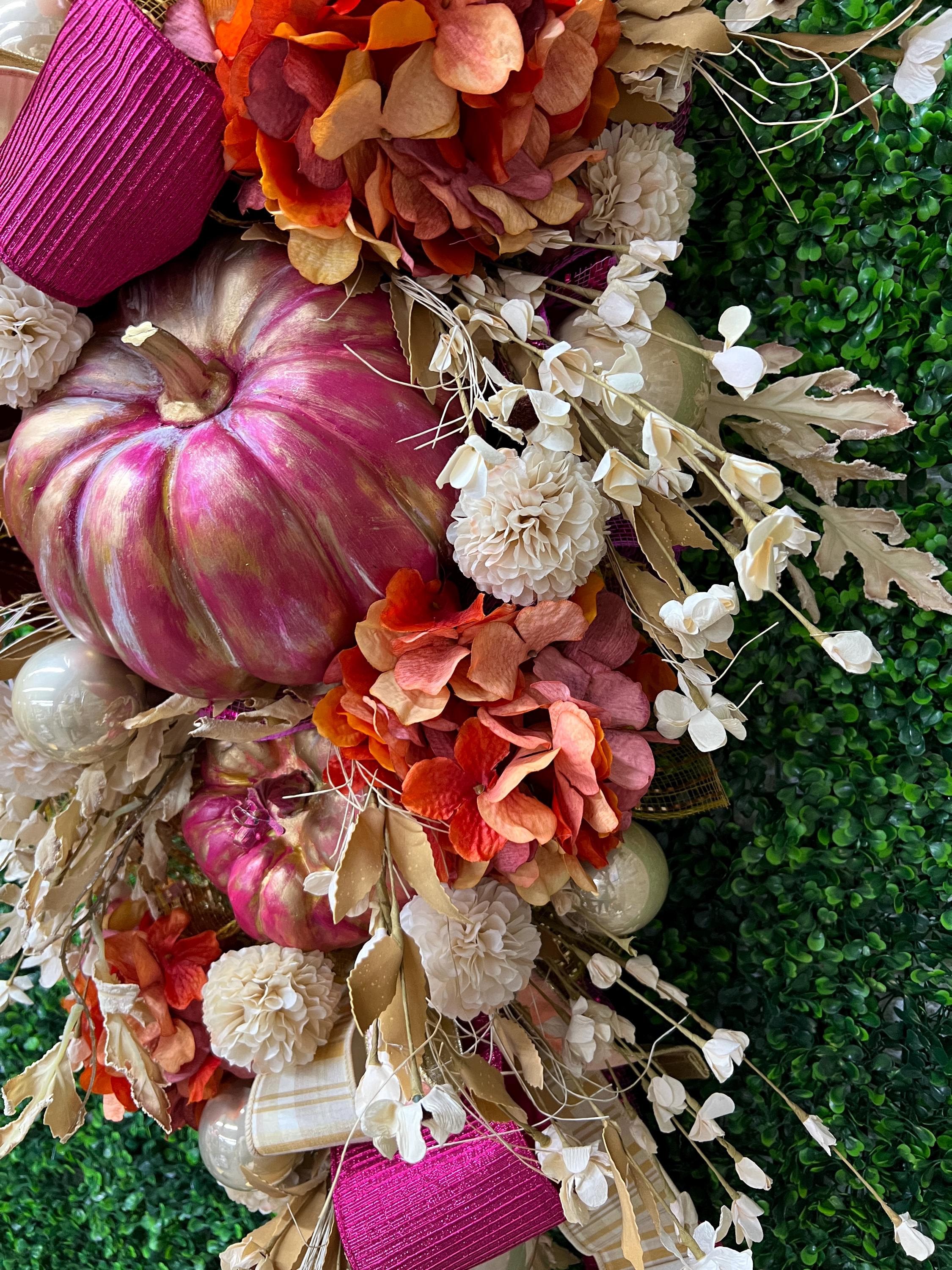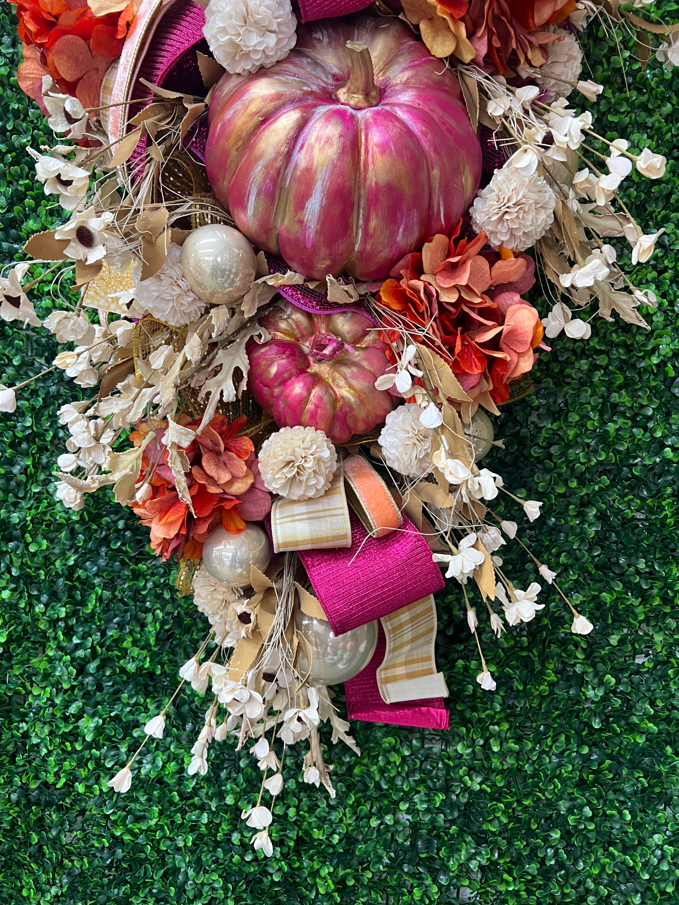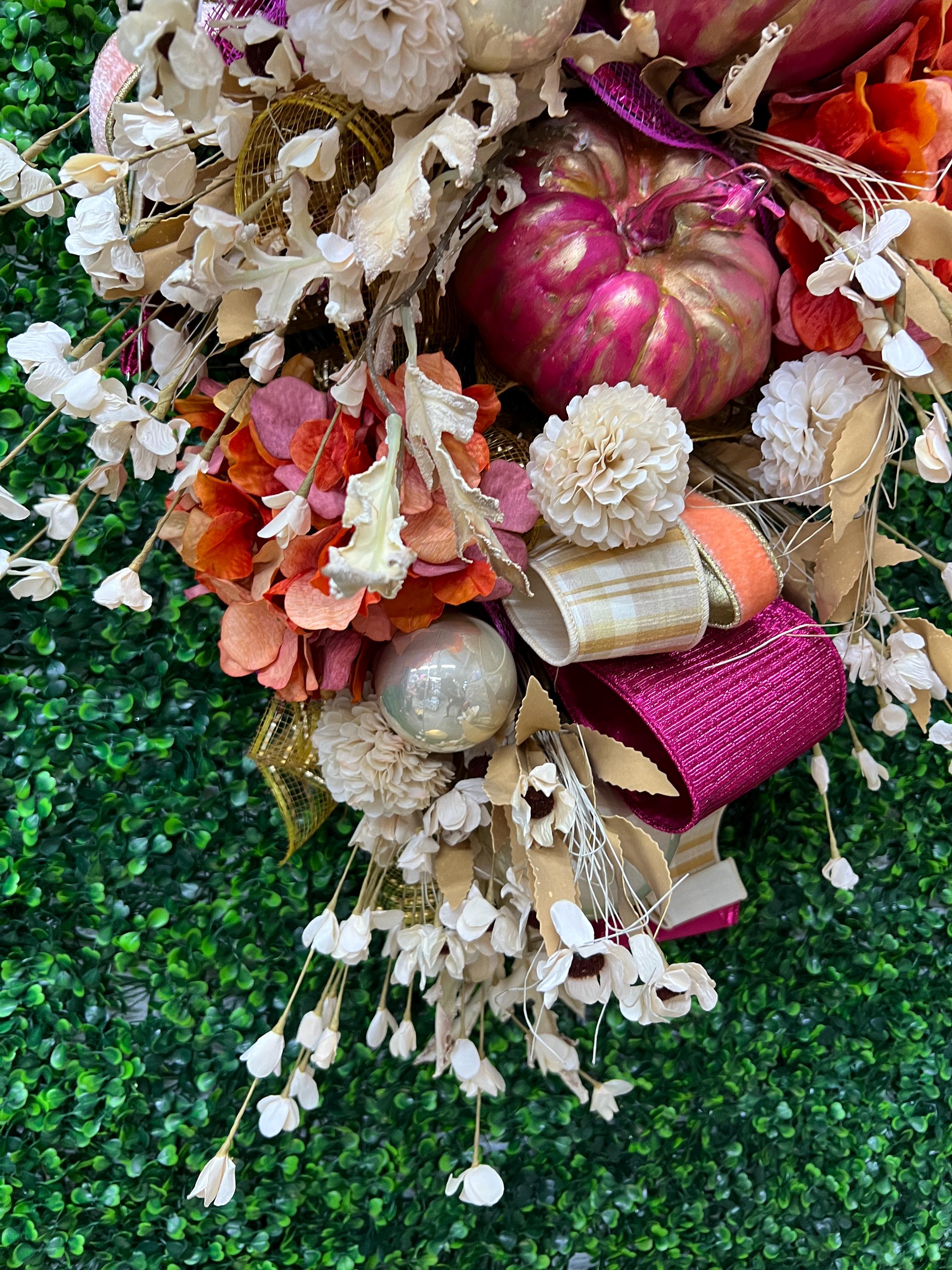 This Fall beauty features hand painted and distressed fuchsia pumpkins, gorgeous designer ribbons and fabulous fall florals. It measured 18 inches wide and 36 inches long. It’s one of a kind and cannot be remade or duplicated- grab it quick!