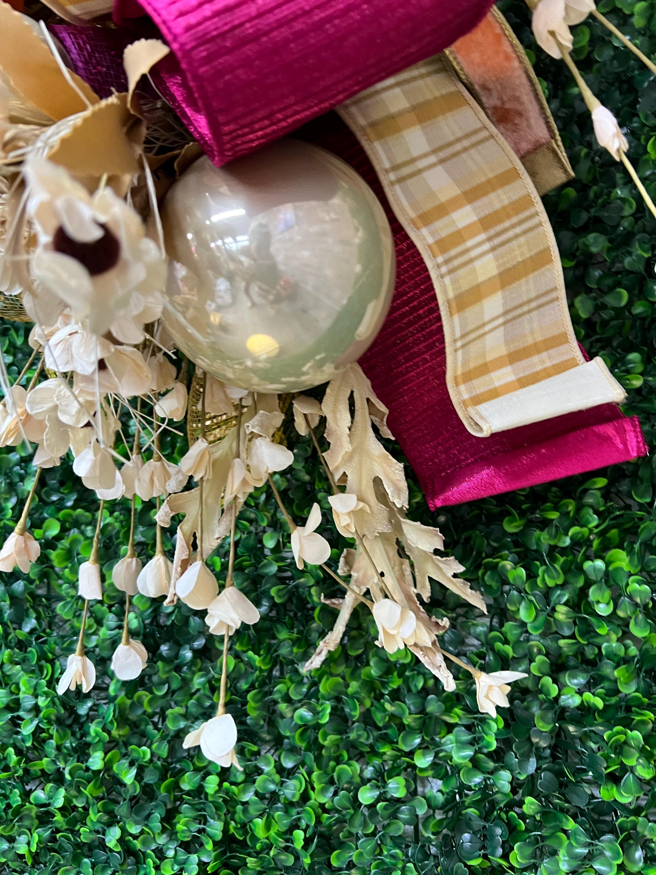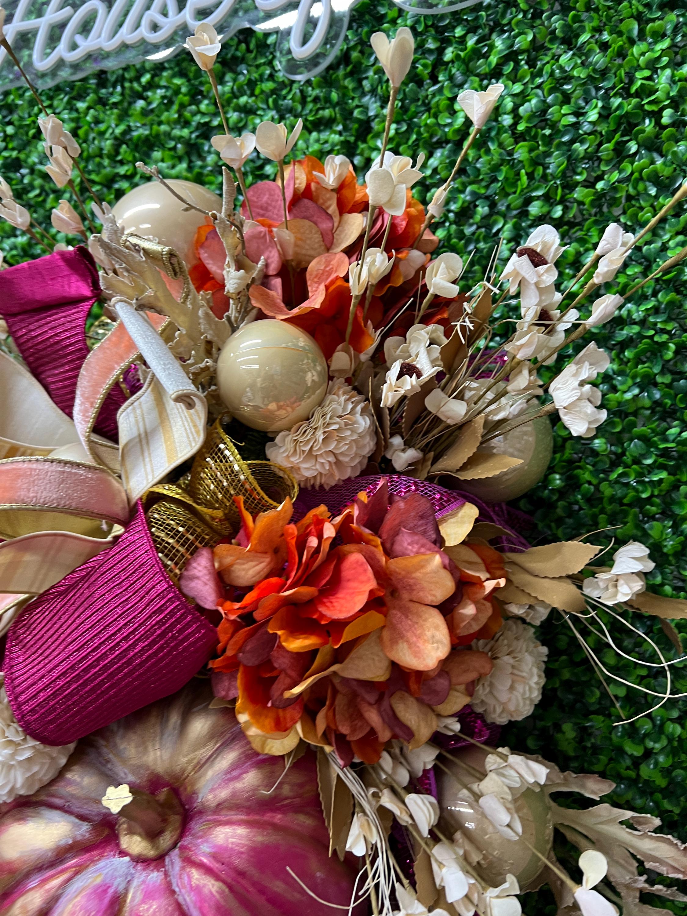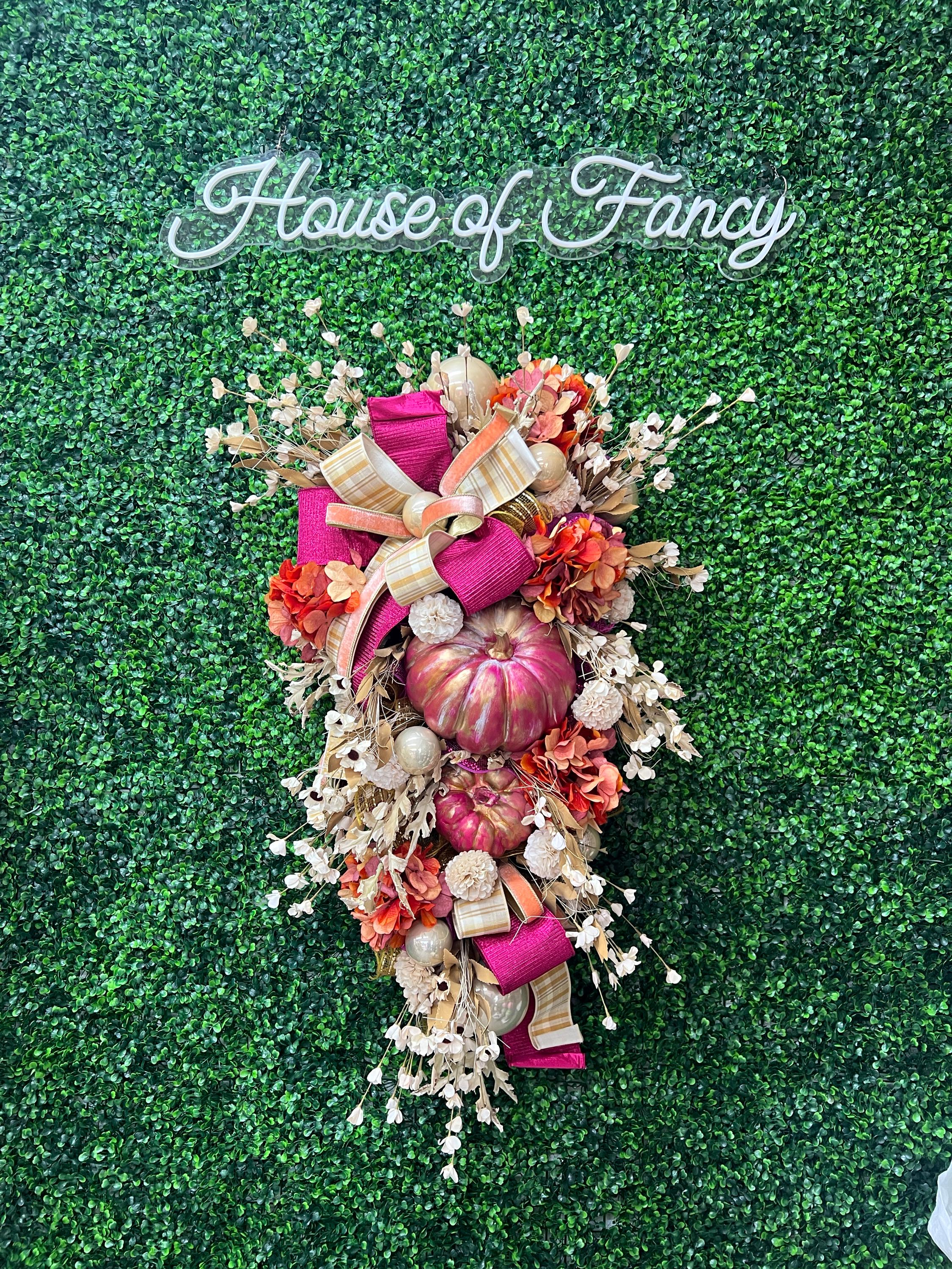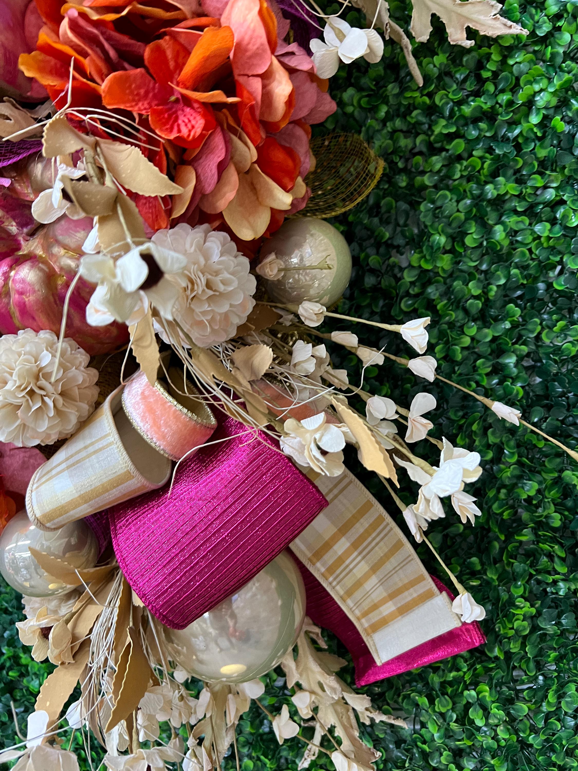 This Fall beauty features hand painted and distressed fuchsia pumpkins, gorgeous designer ribbons and fabulous fall florals. It measured 18 inches wide and 36 inches long. It’s one of a kind and cannot be remade or duplicated- grab it quick!