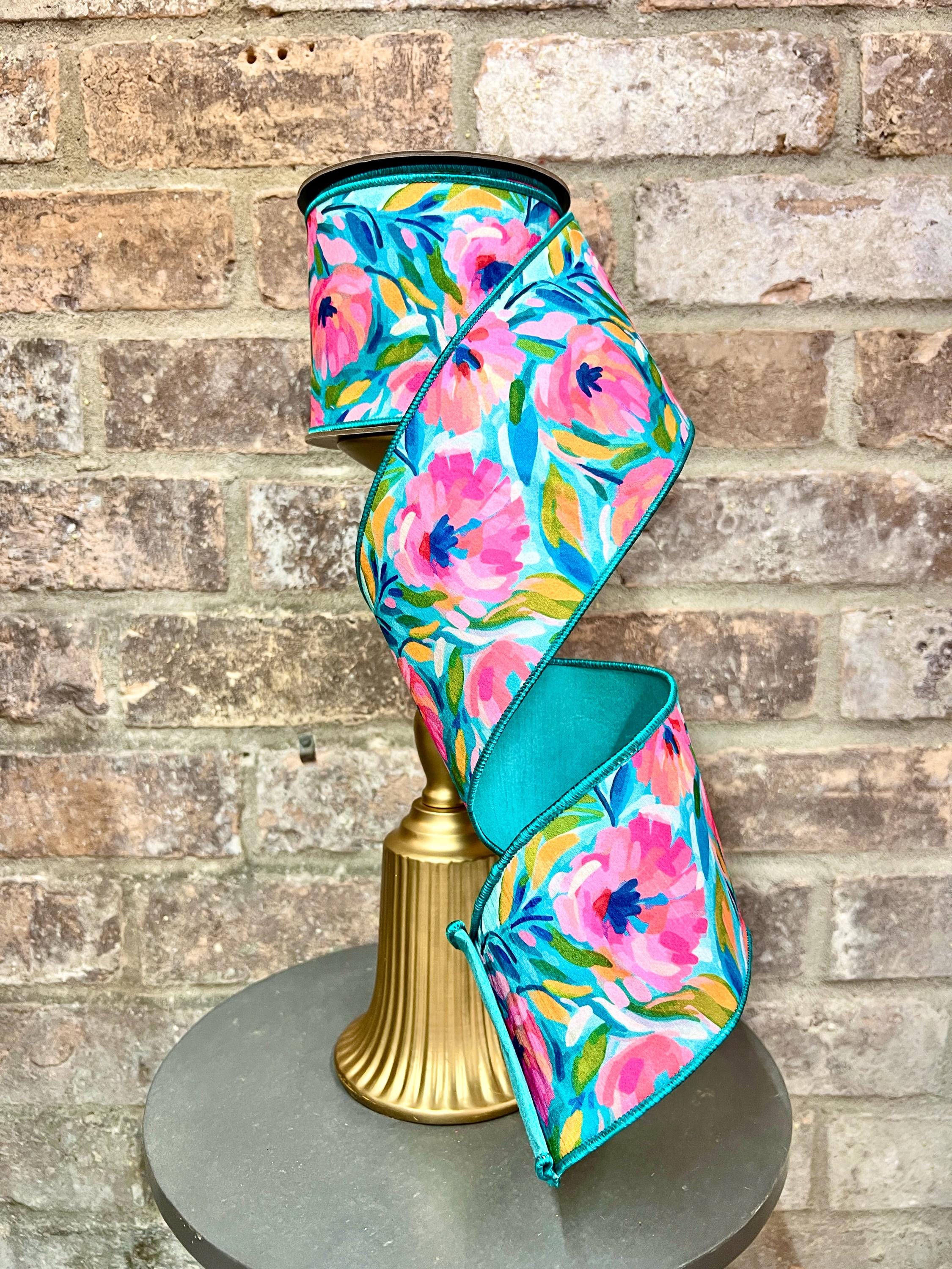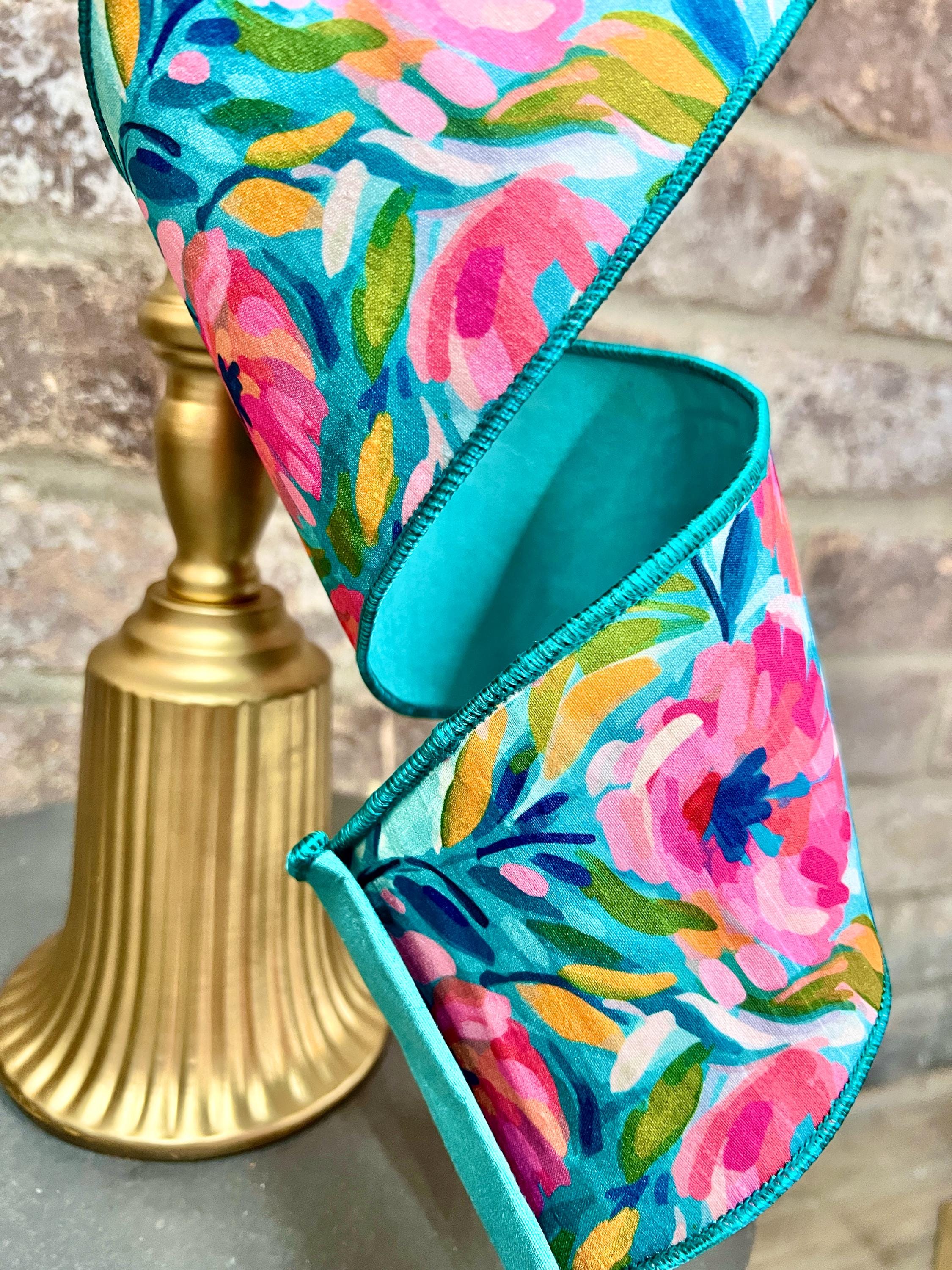 4 inch Pink & Teal Abstract Floral Ribbon ~ 10 yards ~ wired