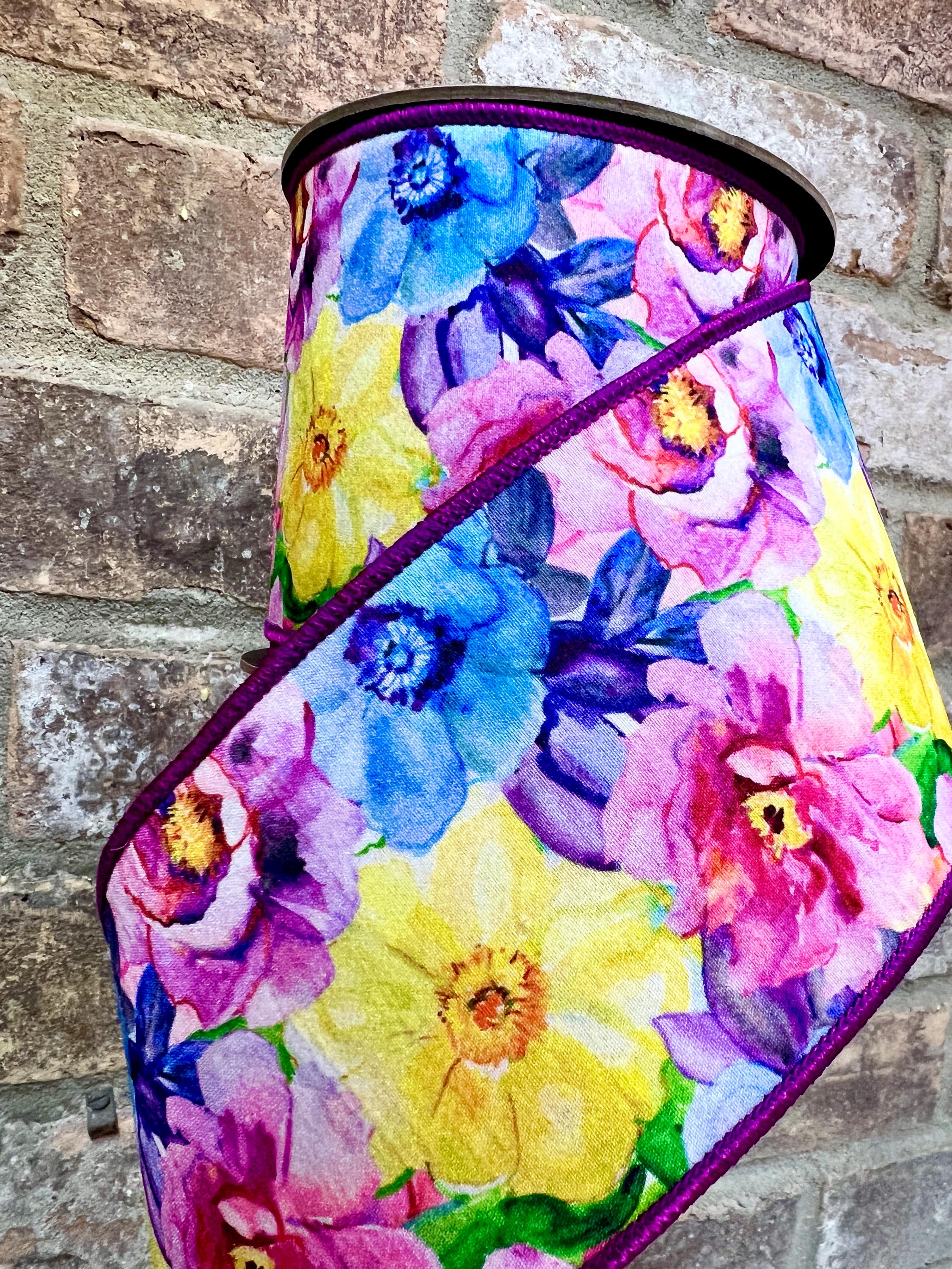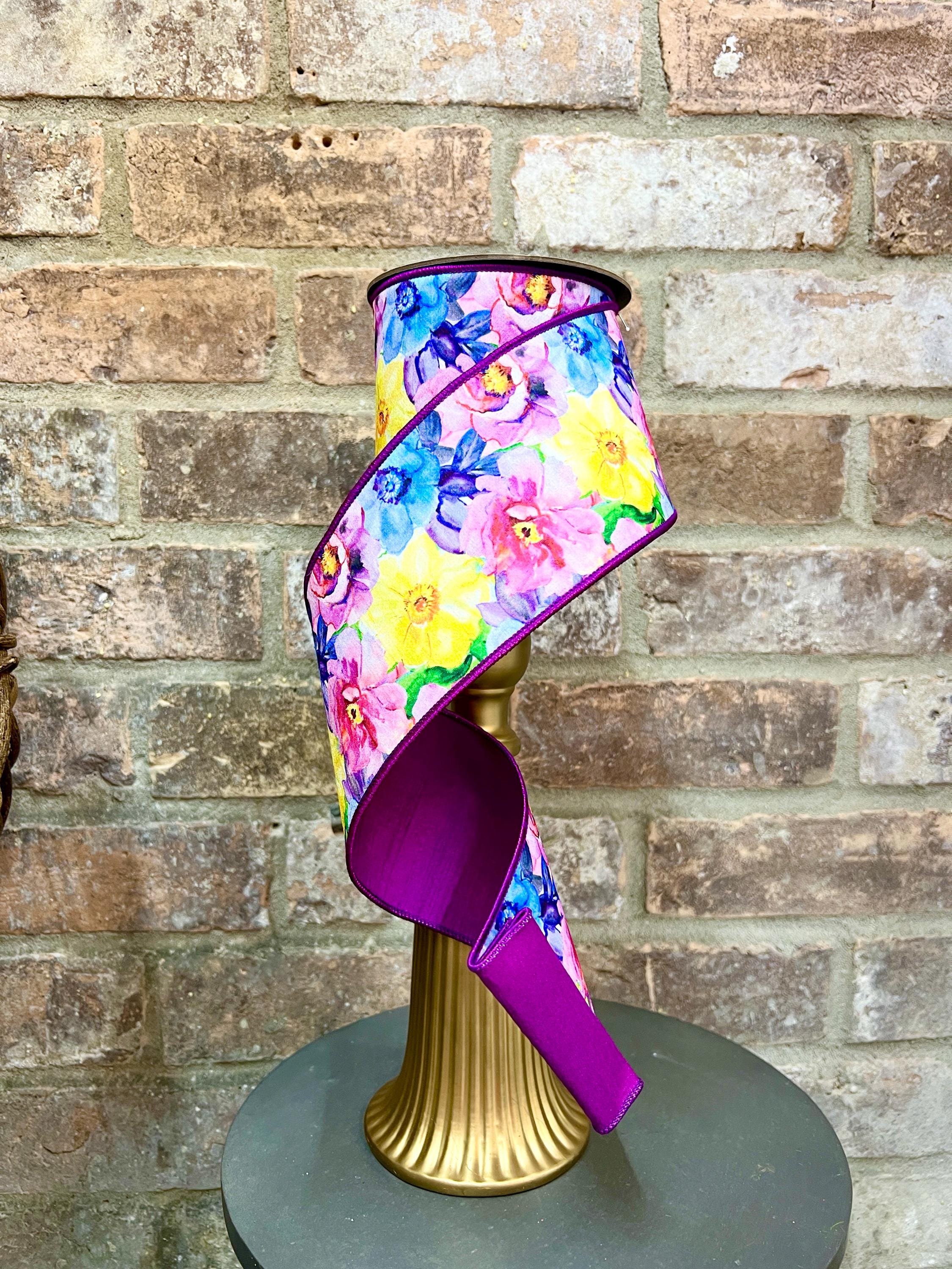 4 inch Purple Watercolor Floral Ribbon ~ 10 yards ~ wired