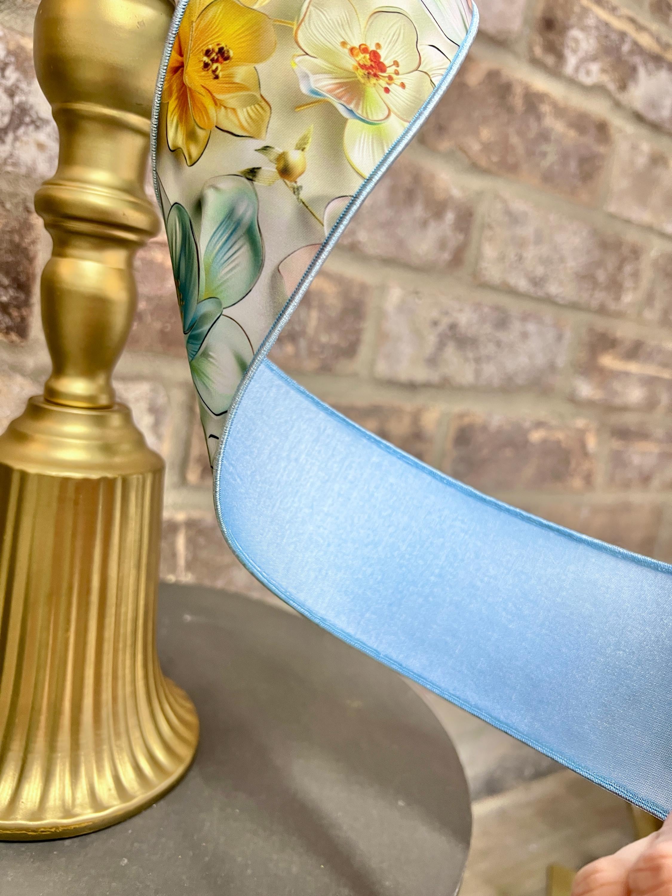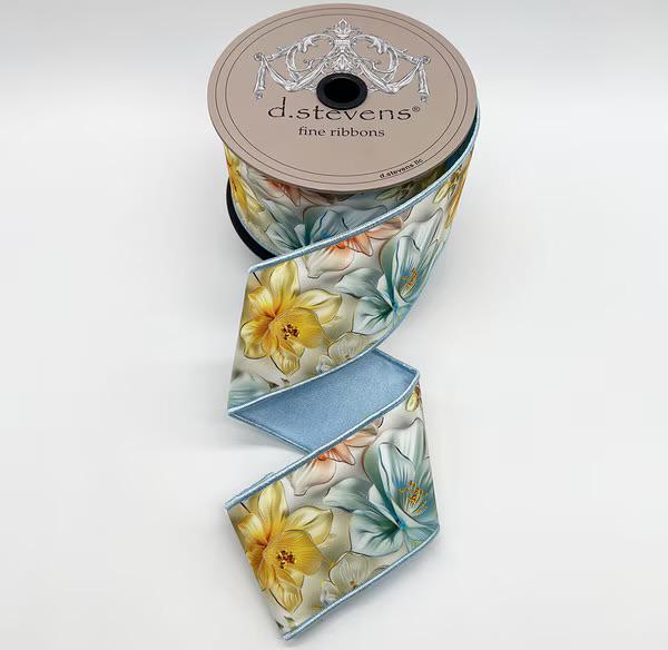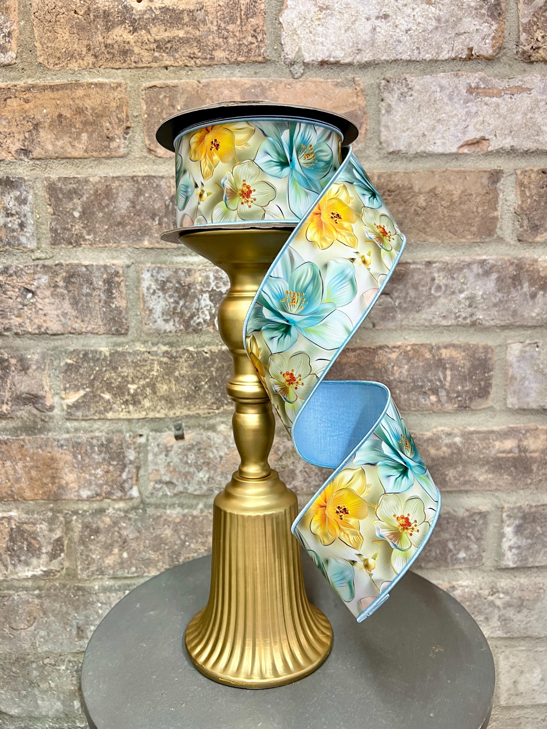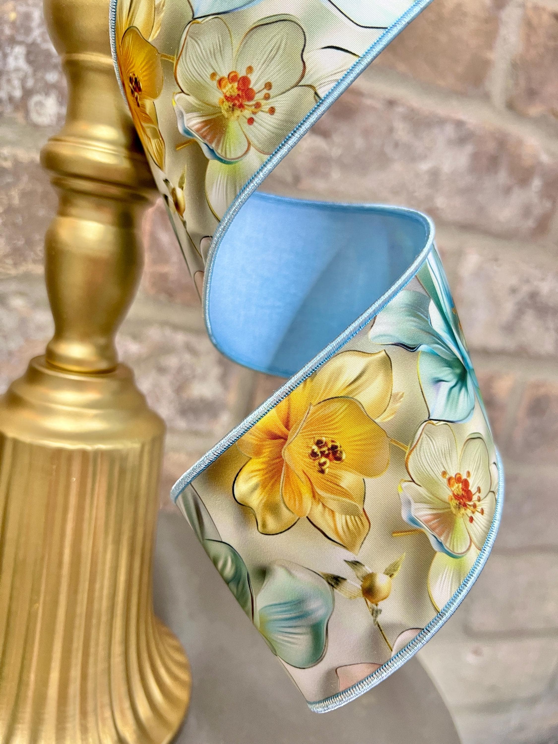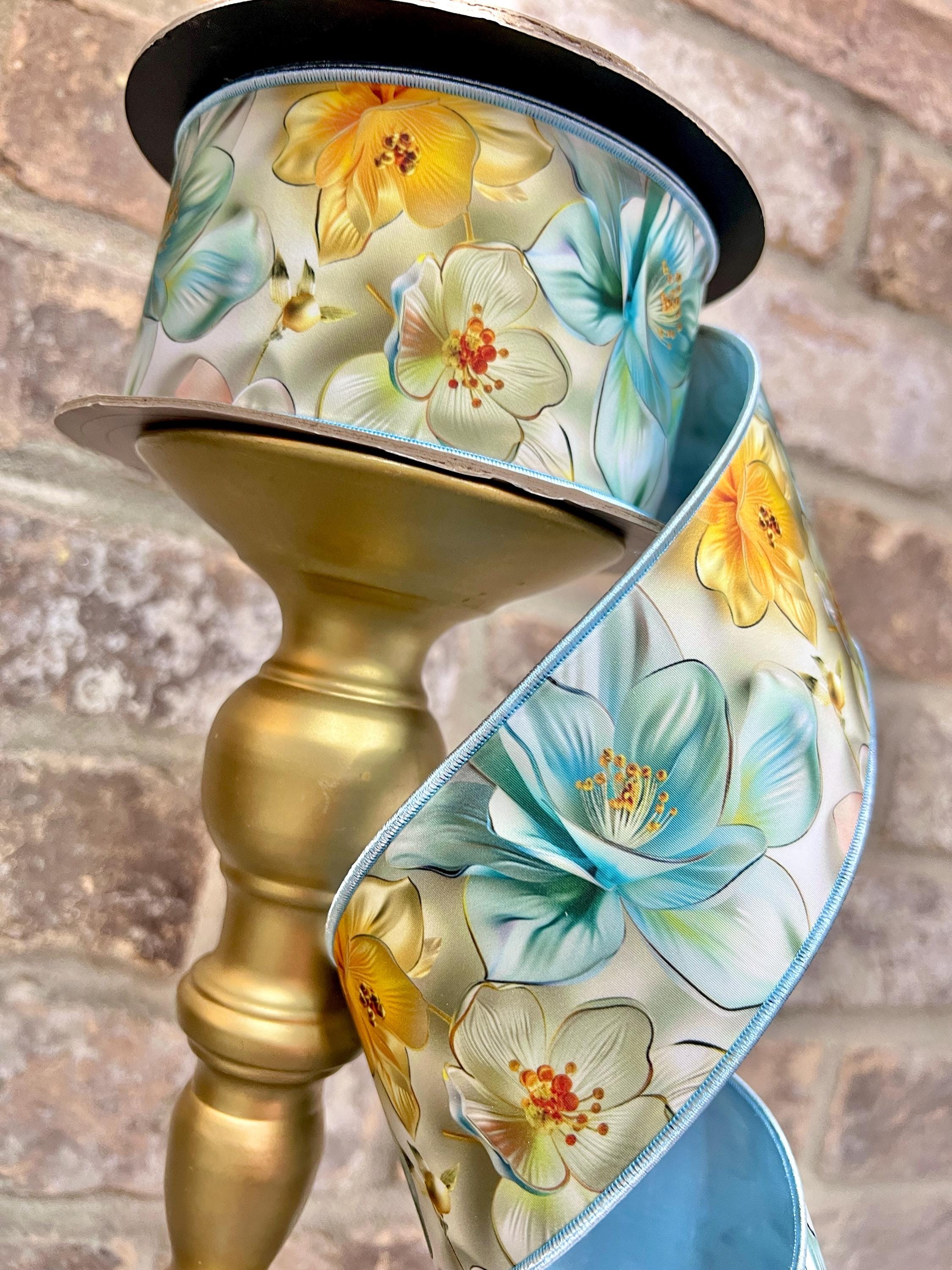 2.5 inch Blue, coral & yellow abstract Watercolor Floral Ribbon ~ 10 yards ~ Wired ~ No Two Alike
