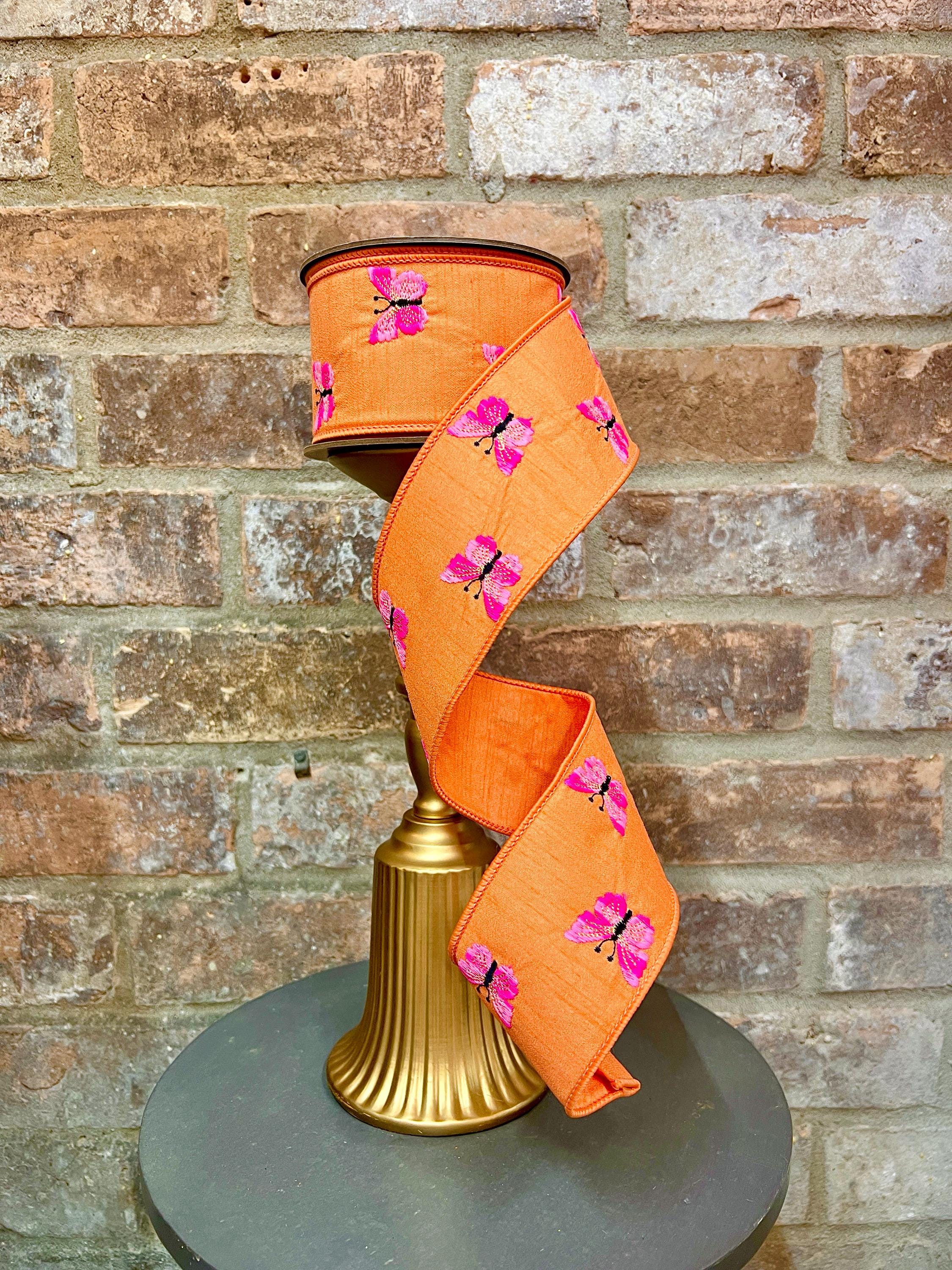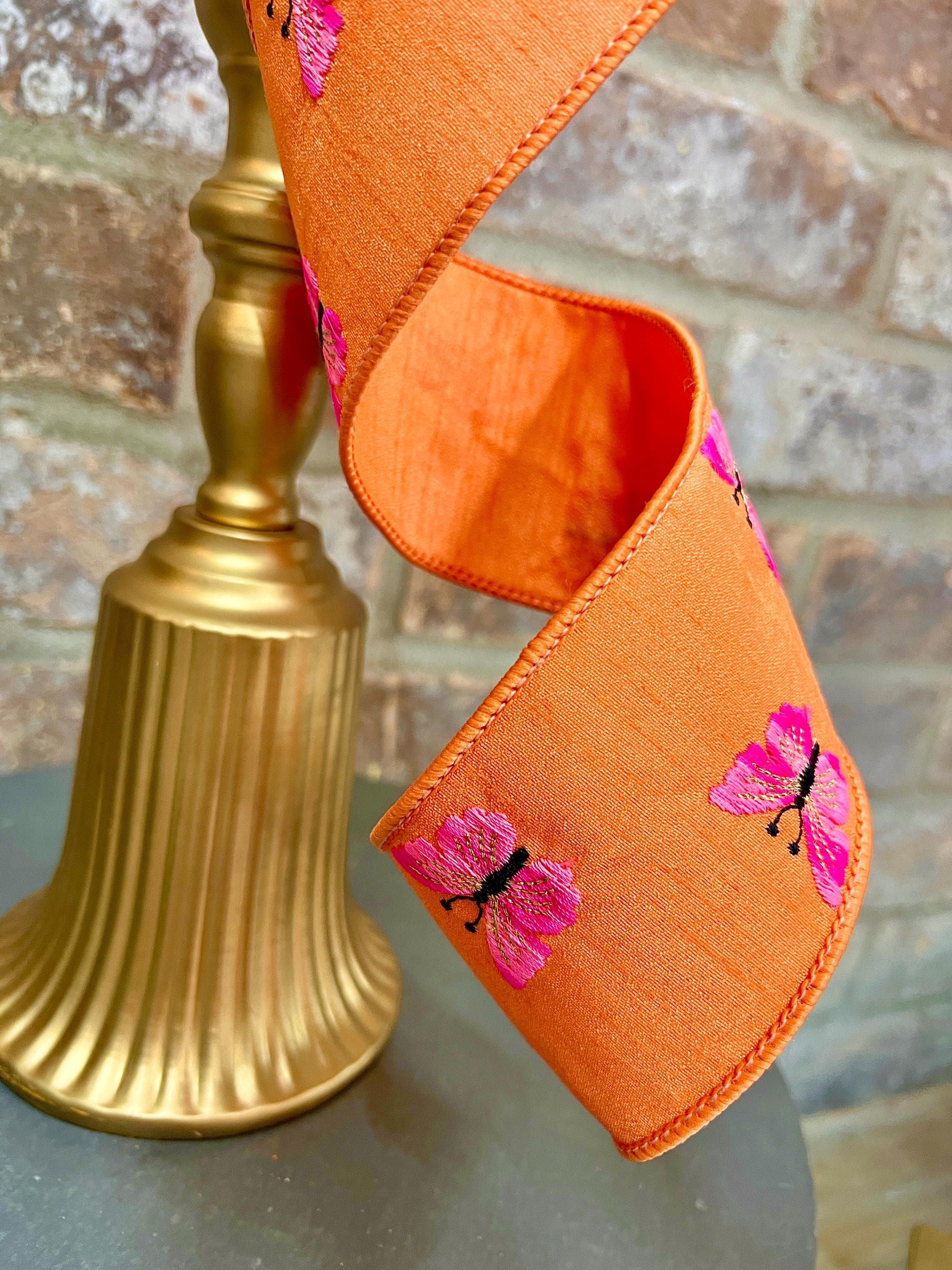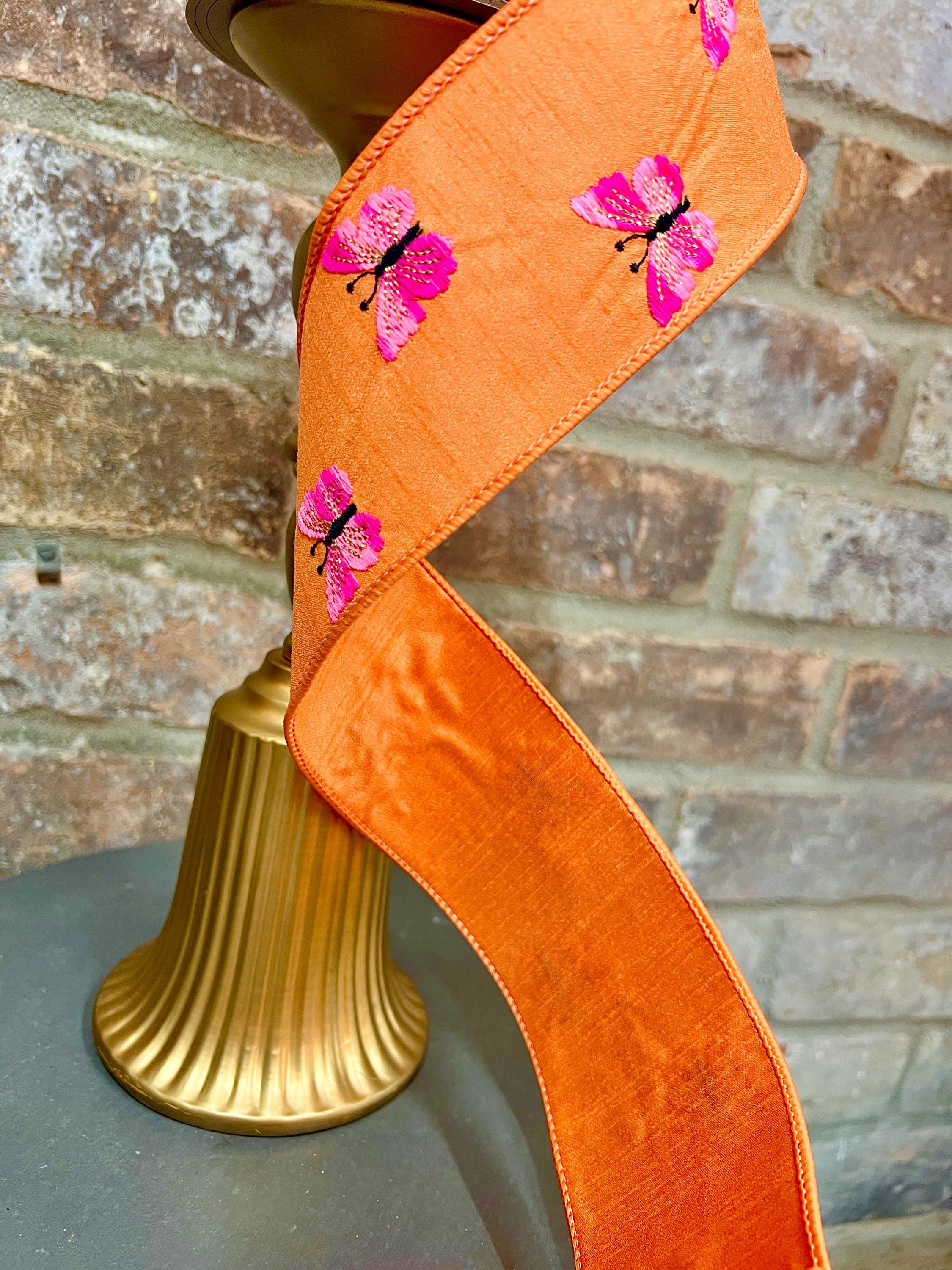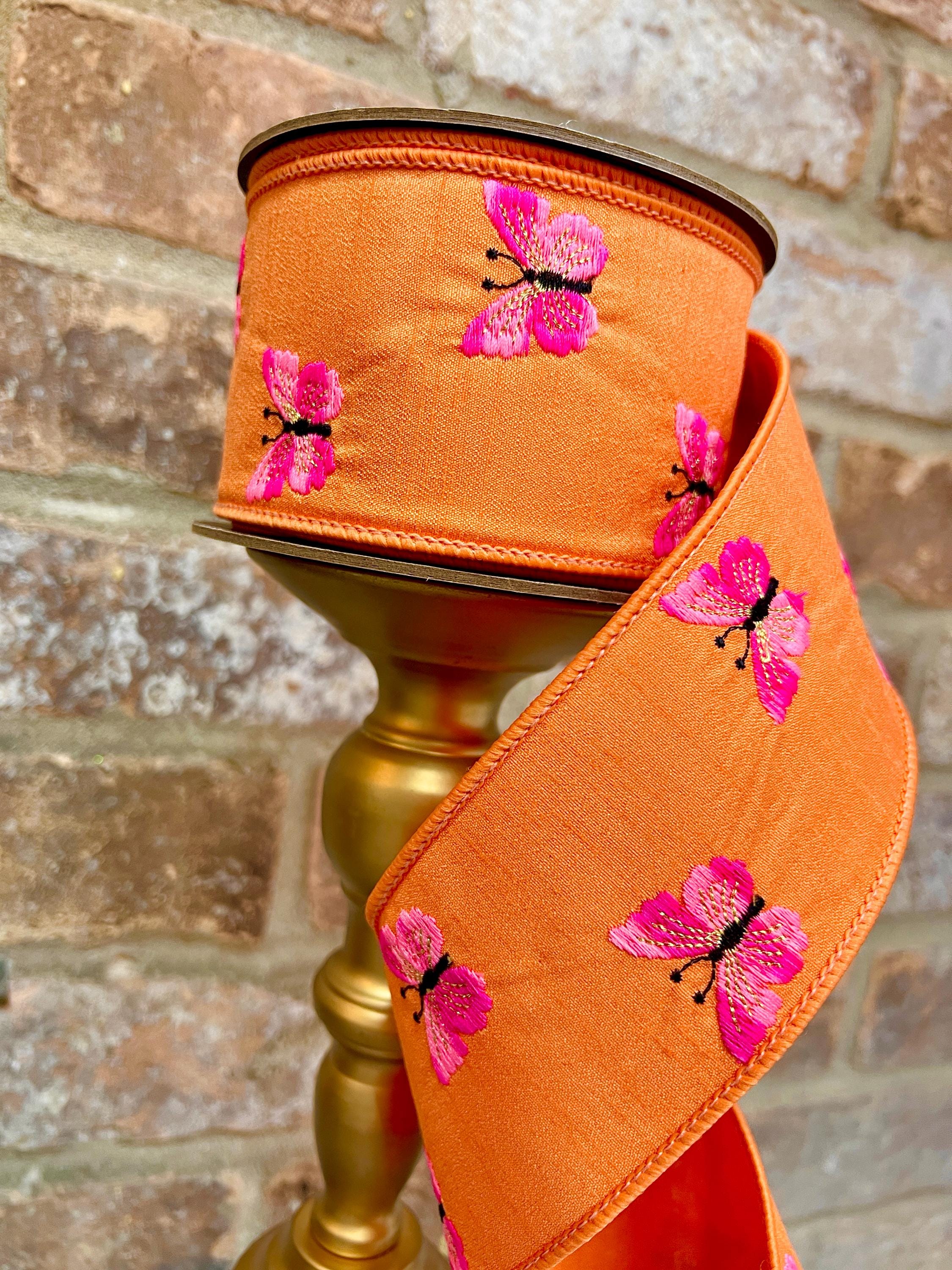 2.5 inch Orange & Two-Tone Pink Embroidered Butterfly Ribbon ~ 10 yards ~ wired